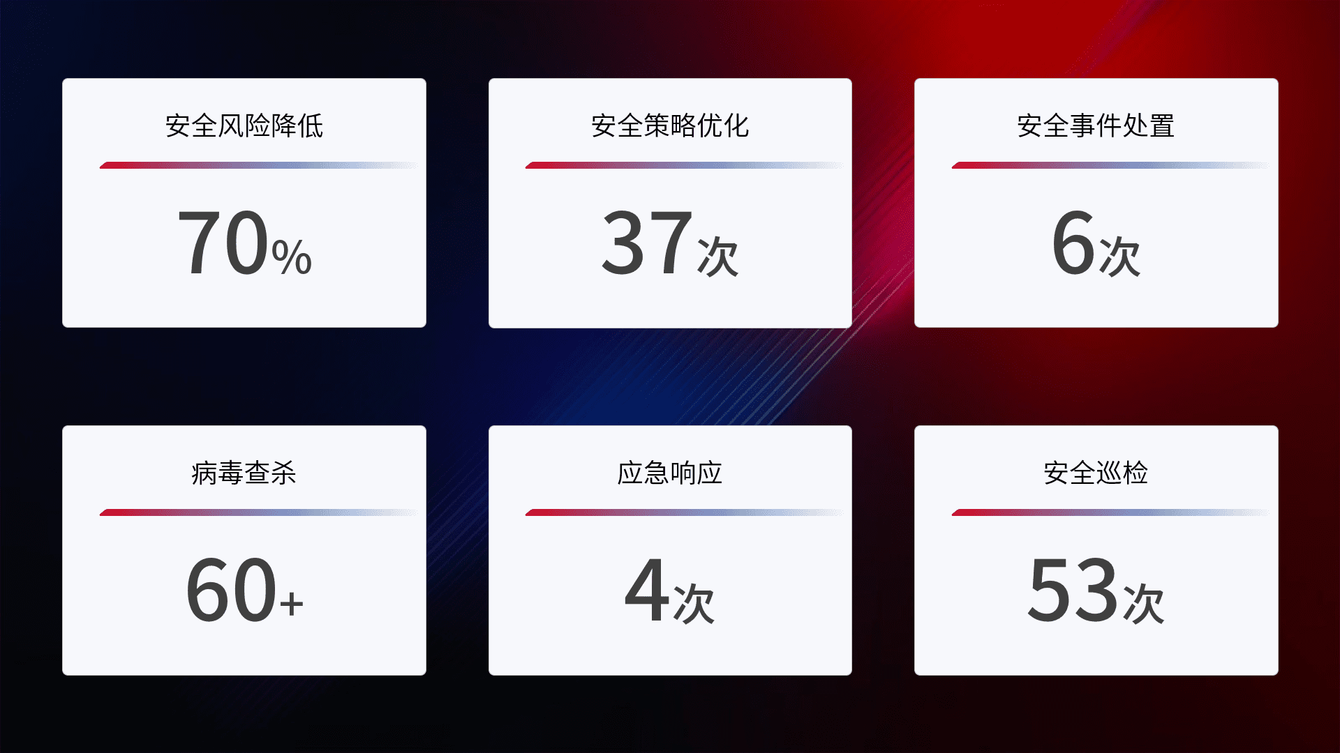 提供全面的安全事件报告体系,,,包括处置报告、、周报、、、、季度和年度总结,,,结合持续监控,,,帮助客户深入了解网络安全状况。。。。